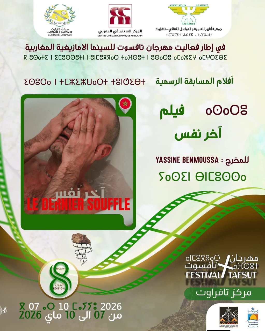 سينمائياً، قدّم فيلمه “آخر نفس” مقاربة تميل إلى الاقتصاد في الحوار مقابل كثافة في التعبير البصري، مع حضور واضح للصمت كعنصر سردي أساسي، وللإيقاع الداخلي للشخصيات كقوة دافعة للحكي. وقد عُرض الفيلم في عدد من المهرجانات الدولية، من بينها العراق وفلسطين، إضافة إلى مشاركته في مهرجان تفراوت السينمائي، ما يعكس انفتاح التجربة على فضاءات عرض متعددة.